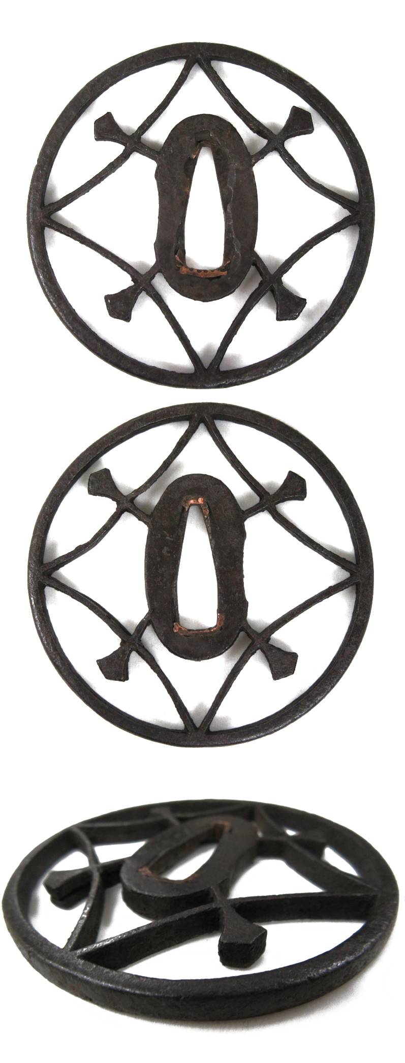 槌目鉄地の丸鍔に、十字の糸巻車を透かしている。糸巻車の図案は尾張物に良く見られることから、尾張鍔である可能性が高い。