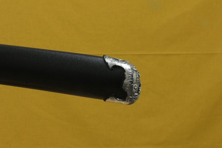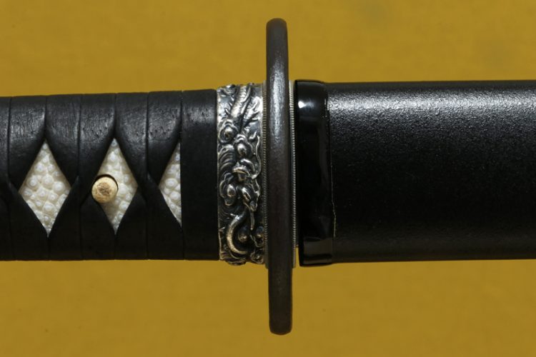 もともと居合用として製作された刀身だけに、非常に軽量でバランスに優れています。拵の金具類は、龍と獅噛(しがみ)の意匠で統一されています。