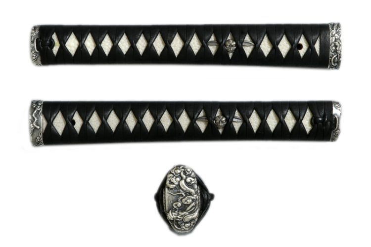 柄(tsuka) :鮫は親粒が付き巻鮫。柄巻きは豚表革の諸捻り巻き。
