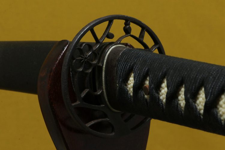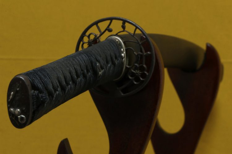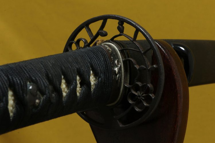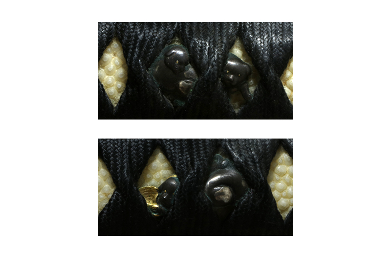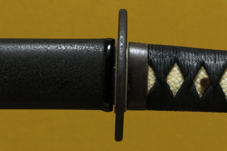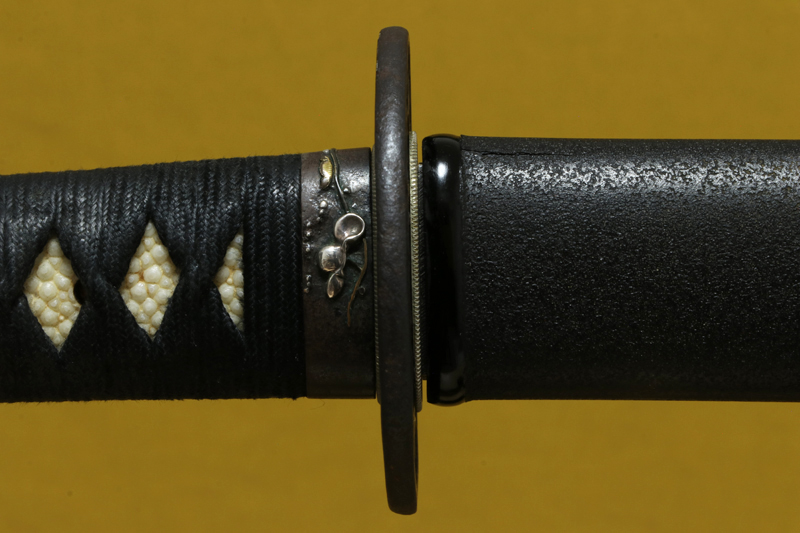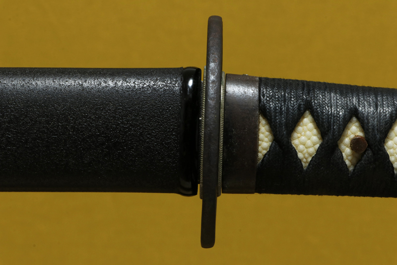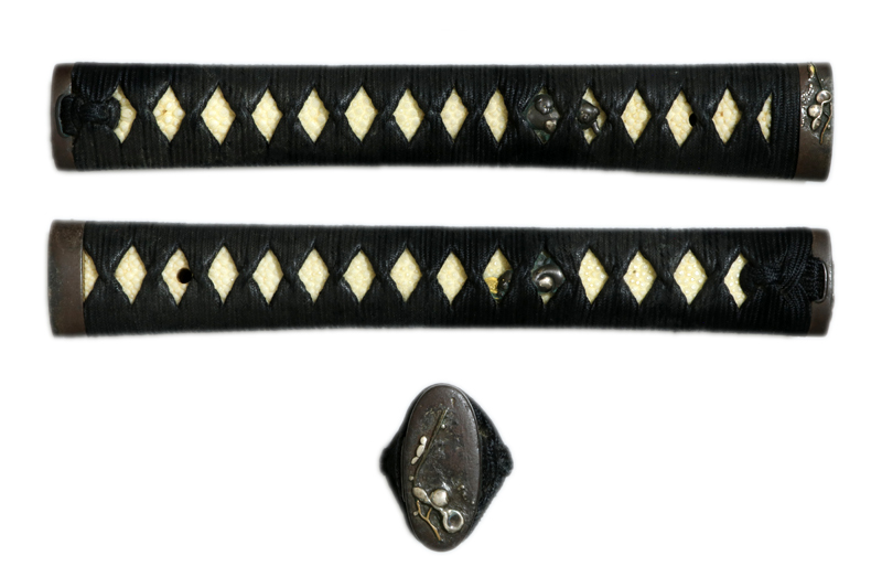 柄(tsuka) :鮫は親粒が付く、柄巻は正絹黒色の諸撮み巻。