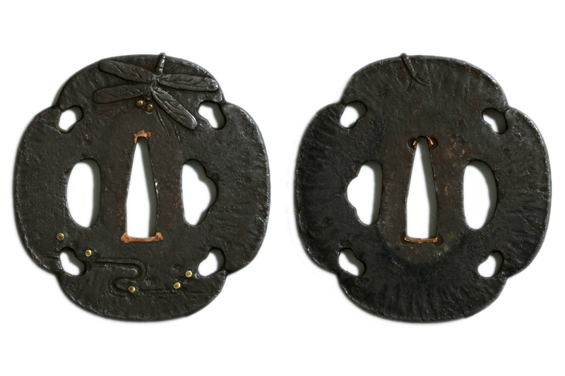 鍔(tsuba) :鉄地木瓜形勝虫の図、四方猪の目透かし。