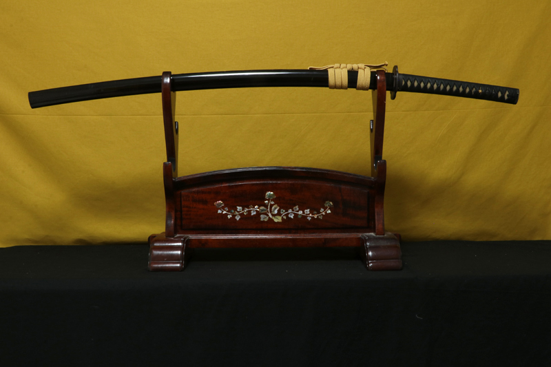 拵は、鞘の塗に剥がれや修復のあとが有ります。また柄は最近作られた物で柄下地は桜の木で作られています。