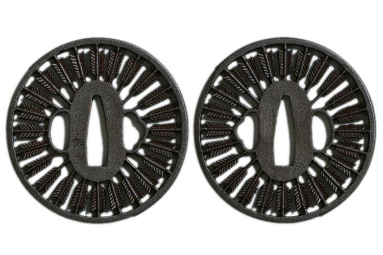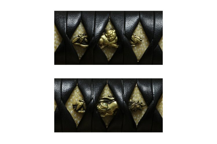 縁頭(futikasira):鉄地肥後八橋の図金象嵌(江戸時代の物)。