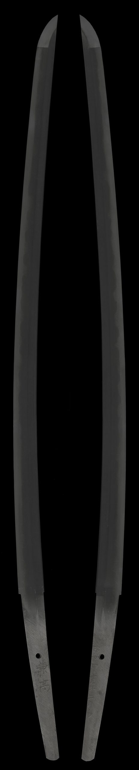 鎬造り庵棟、身幅やや太く重尋常、鳥居反り中鋒。茎は生で筋違い鑢がかかる。