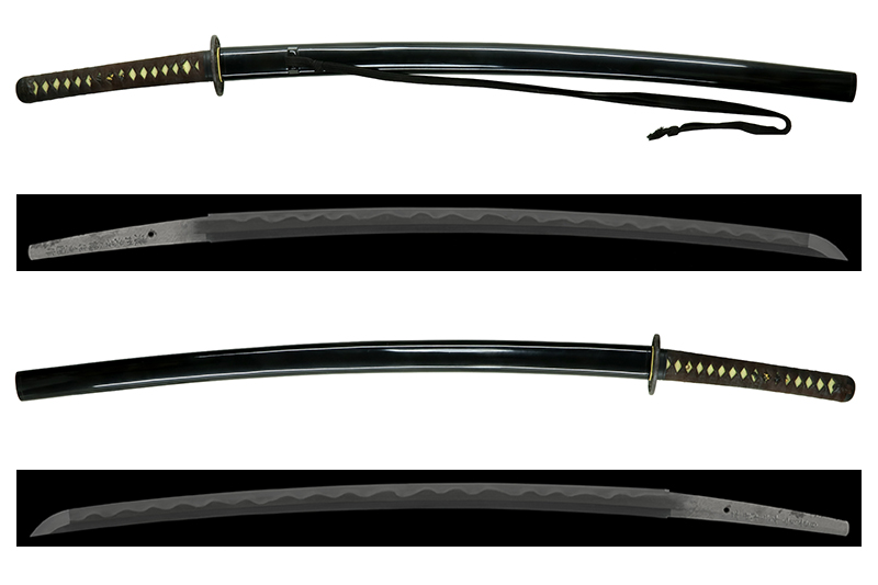 This particular sword was not made for iaido practice but as an art sword. Therefore, it has a wide and powerful blade shape and features the magnificent tōran-ba (billowing wave-style hamon) for which Kanekuni was especially known.