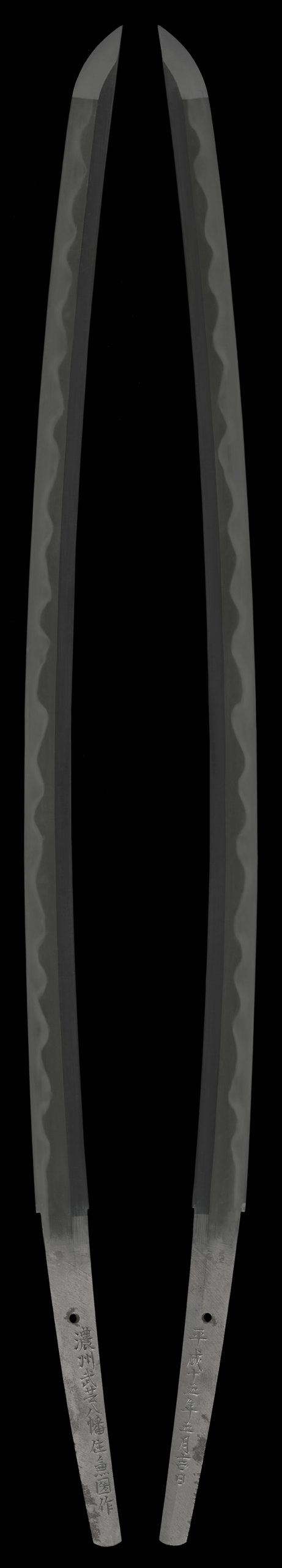 本作は居合用ではなく 美術刀として製作された一振り です。そのため身幅が広く豪壮な姿をしており、兼圀刀匠が得意とした 見事な濤乱刃(とうらんば) が焼かれています。