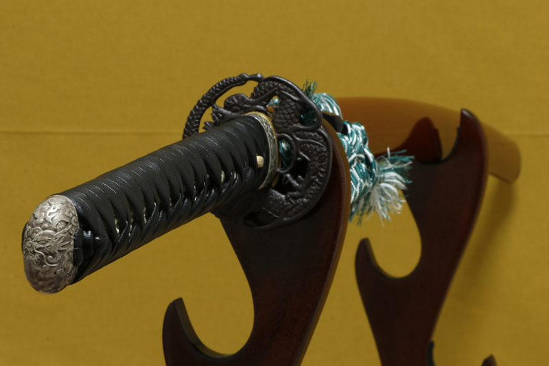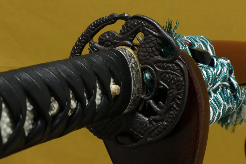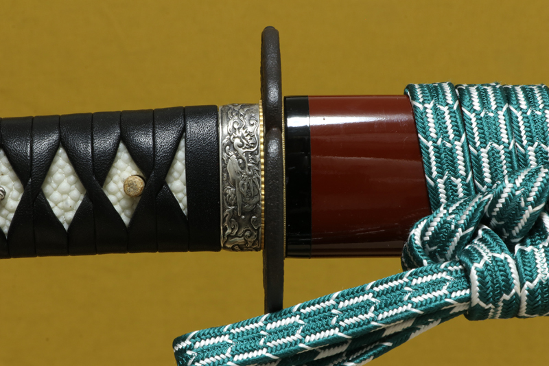 鞘は新品で、柄はリペア済みです。鮫皮は張り替え、縁頭・目貫・鍔・切羽はすべて新品に交換し、柄巻は黒の表革で新たに巻き直しています。下緒も新品です。