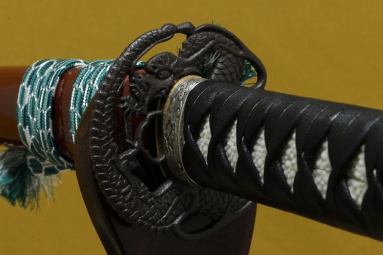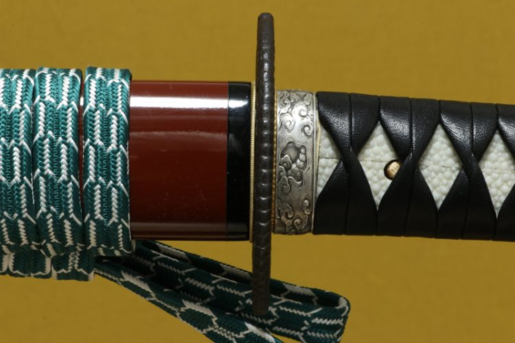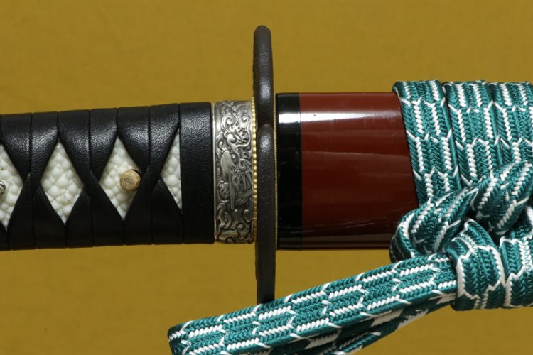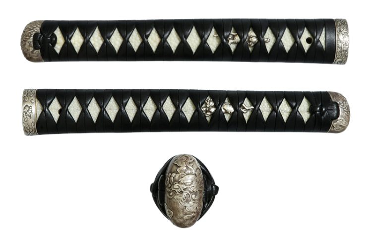 柄(tsuka) :鮫は親粒が付き巻鮫。柄糸は牛表革の諸捻り巻。
