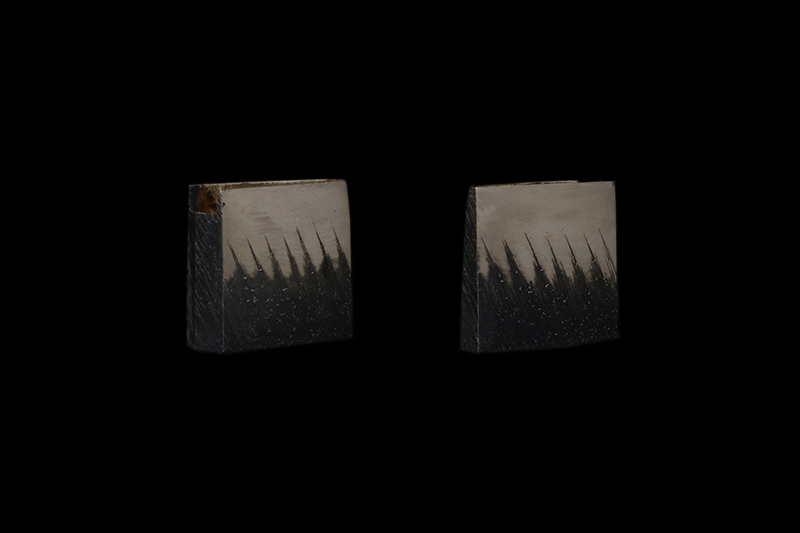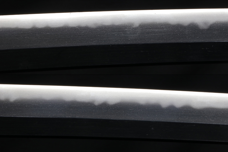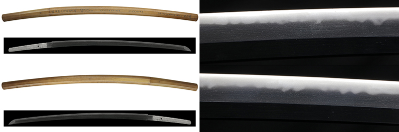 刃紋は互の目丁子刃、足良く入り尖り刃を交え飛び焼きを見せる。刃中は葉が入り金筋が働く。釯子は乱れ込み小丸に返る。