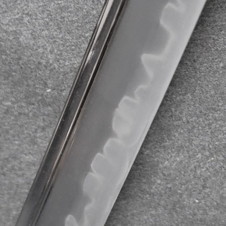 地鉄は板目肌が刃縁の辺りで流れ柾となる、良く練れて良く積んだ黒味のある地鉄に、地沸良く付く。