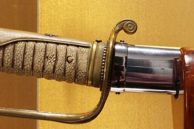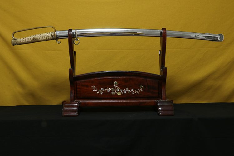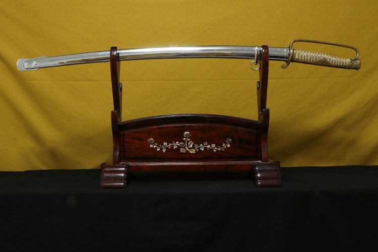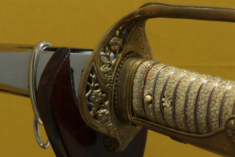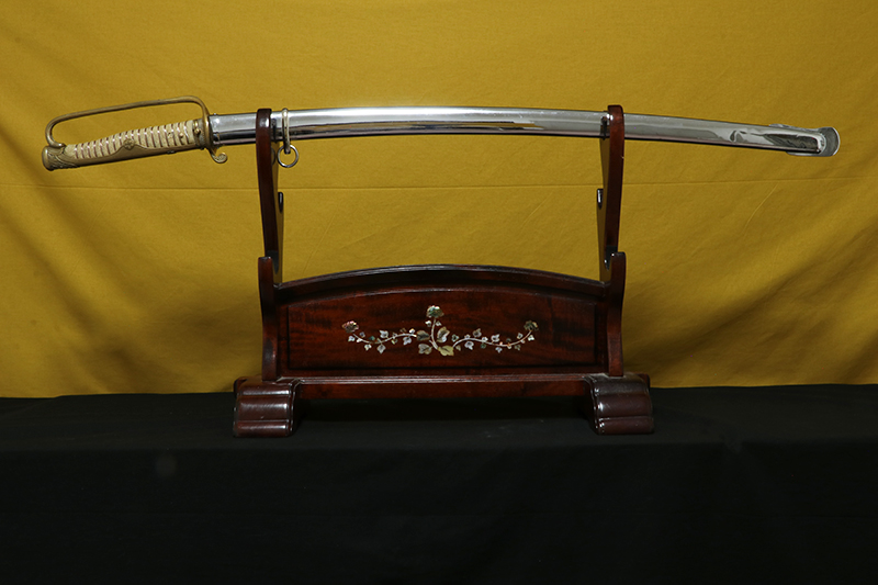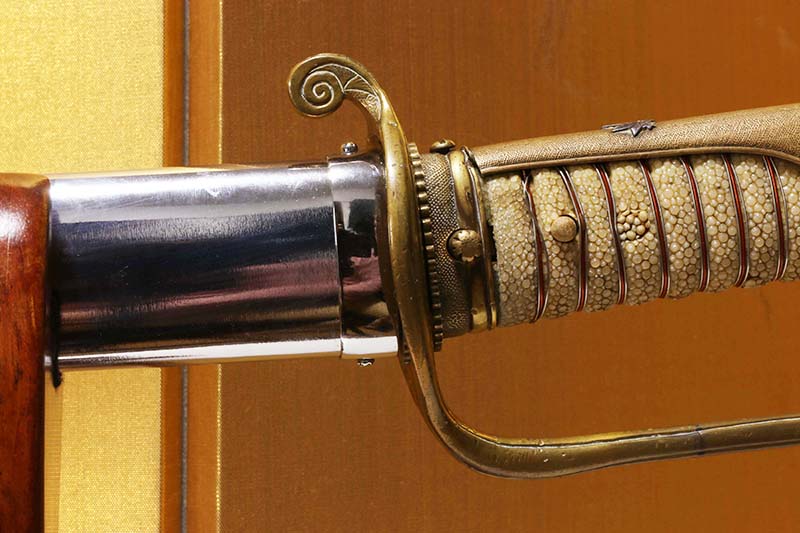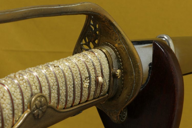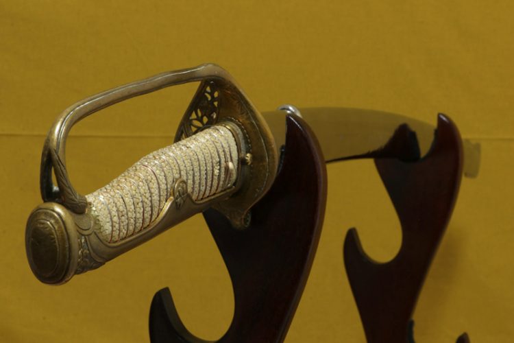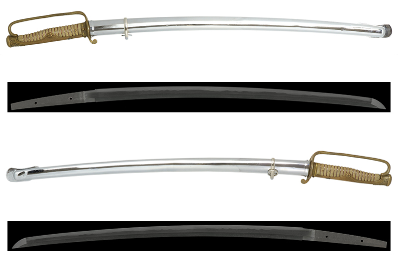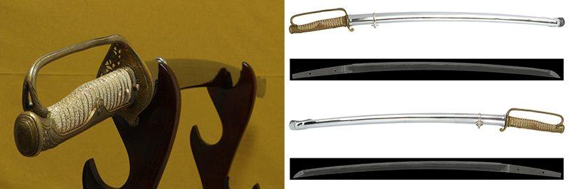 付属する軍刀拵は、日本陸軍尉官用両手握りサーベル拵で、明治時代後期から94式軍刀拵が採用されるまで使用された軍刀です。