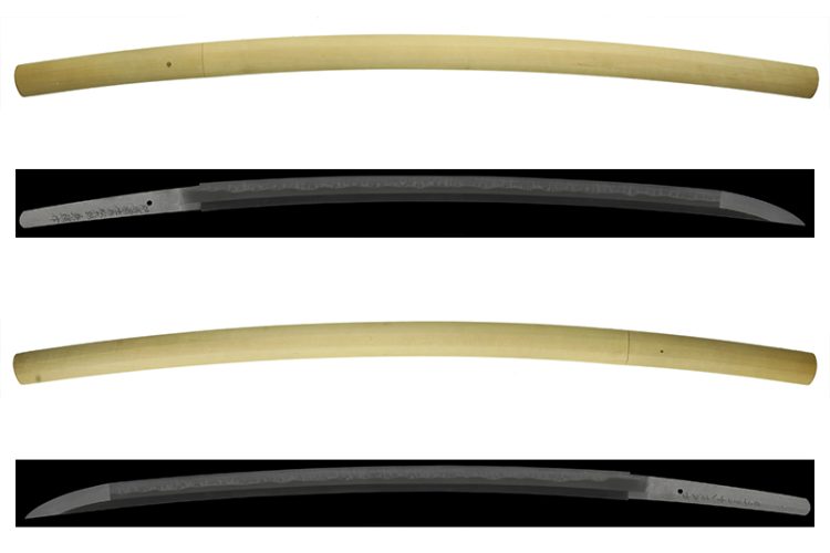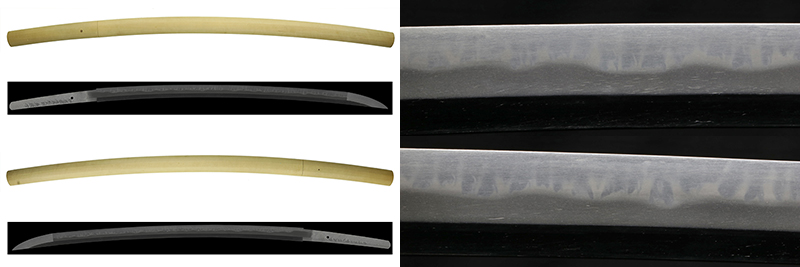 This piece is a well-known Kiyomaro utsushi. It features a powerful and imposing sugata with a motohaba of 36.6 mm and an ō-kissaki measuring 110 mm, combined with an excellent choji hamon richly animated with striking kinsuji activity.