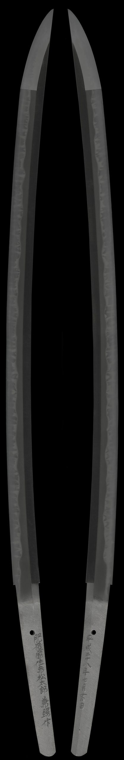 赤松太郎兼照、本名は木村兼弘、木村兼嗣刀匠の次弟で、弟は兼裕、木村兼光・木村兼幸の叔父。 赤松太郎は、兼嗣を筆頭として兼裕、兼照、その他の門人を育成している。全ての刀工は赤松太郎と銘を付け清麿写しには定評がある。 自家製鉄により玉鋼を制作して作刀を行う為、現在流通している日刀保の玉鋼とはやや趣きが異なります。 本作は有名な清磨写しです、元幅が36.6mm、鋒が110mmある豪壮な刀姿に、金筋が凄く働いた丁子刃を焼いた優れた作品です。赤松太郎の清磨写しでも、この作品ほど大鋒で刃中の働きが抜群な物は少なく、大変貴重な一振りです。