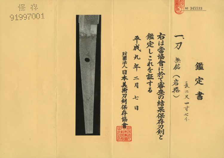鎬造り庵棟、身幅重尋常、鳥居反り中鋒。茎は茎尻を短く切断られ、棟側と刃側を削り、茎尻は一文字に切られています。
