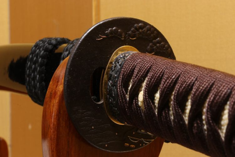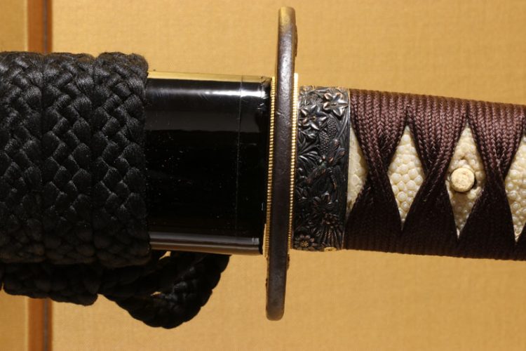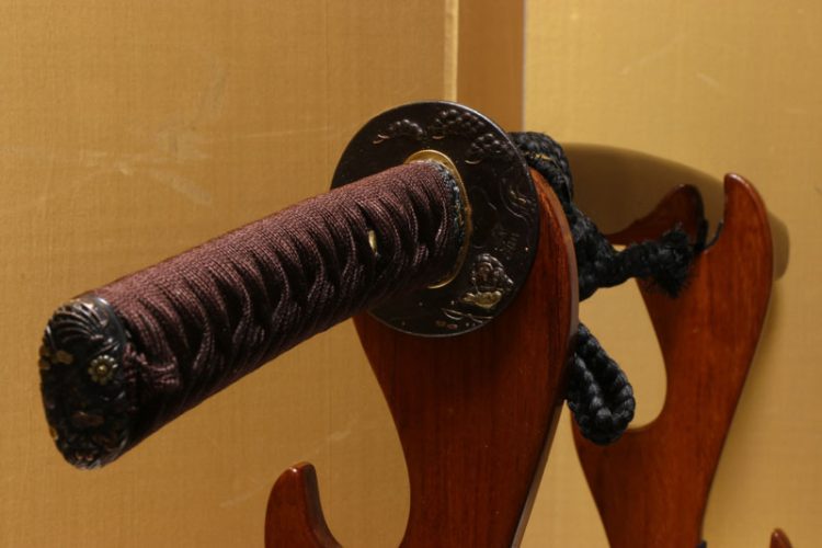 拵(こしらえ)は傷んでいたため修復されており、柄(つか)は鮫皮を張り替え、柄糸も新しく巻き直されています。鞘(さや)は新品です。