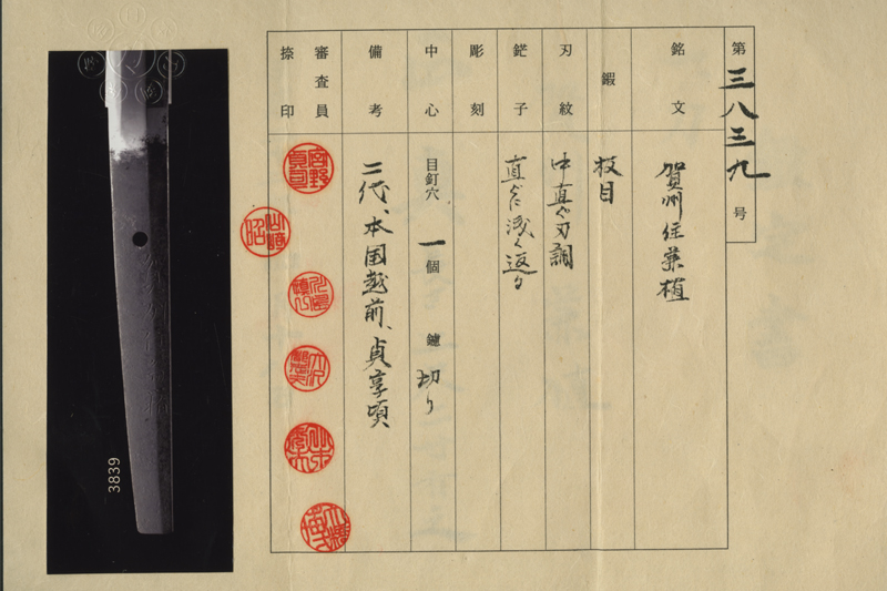 Kanetsune of Kashū (Kaga Province) belonged to the Echizen-Seki school, originally based in Echizen Province. In the late Muromachi period, he relocated to Kaga, accompanying Lord Maeda Toshiie when Maeda was transferred from Fuchū in Echizen to Kaga.