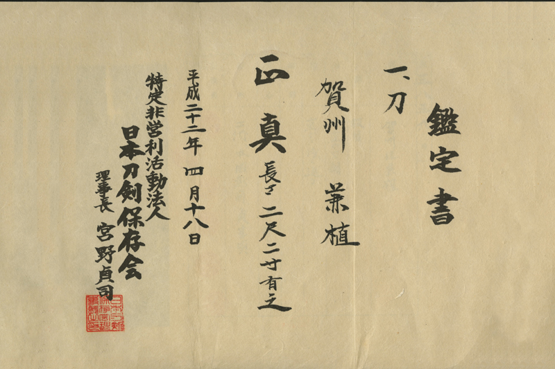 この刀は、二代目兼種の作とされています。刀身は慶長新刀の力強い姿をしており、大きな鋒(きっさき)を備え、非常に迫力のある印象です。鑑定書では貞享頃の二代兼種の作とされていますが、初代加州兼種の作である可能性も高いと考えられます。