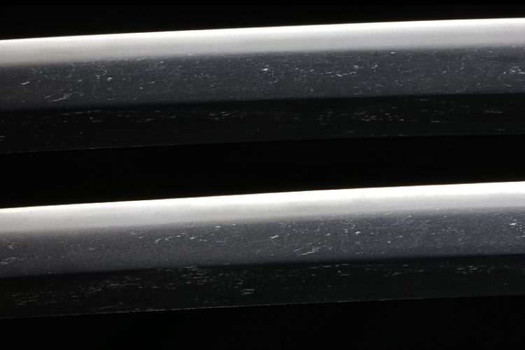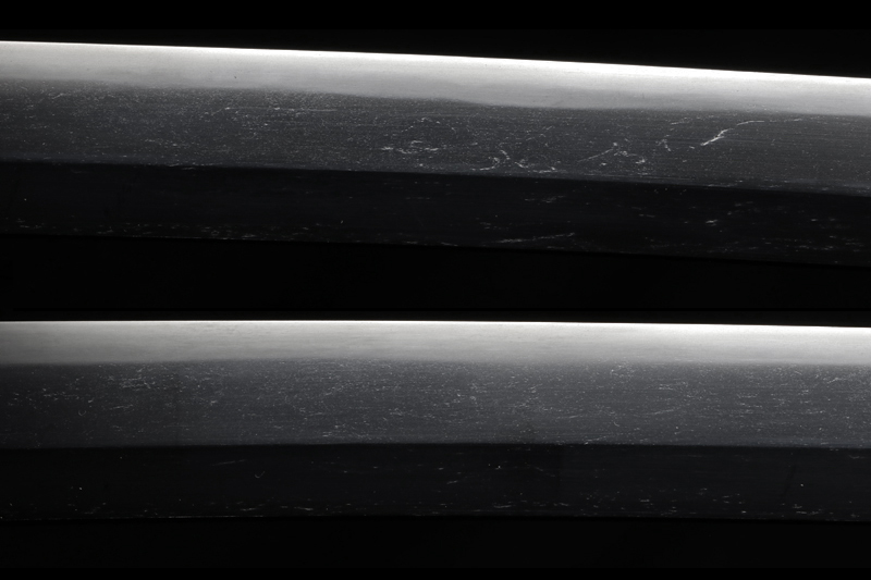地鉄は美しい板目肌で、白け映りが明瞭に現れています。刃文は中直刃で、小沸がよく働いており、優れた技量がうかがえる見事な出来です。