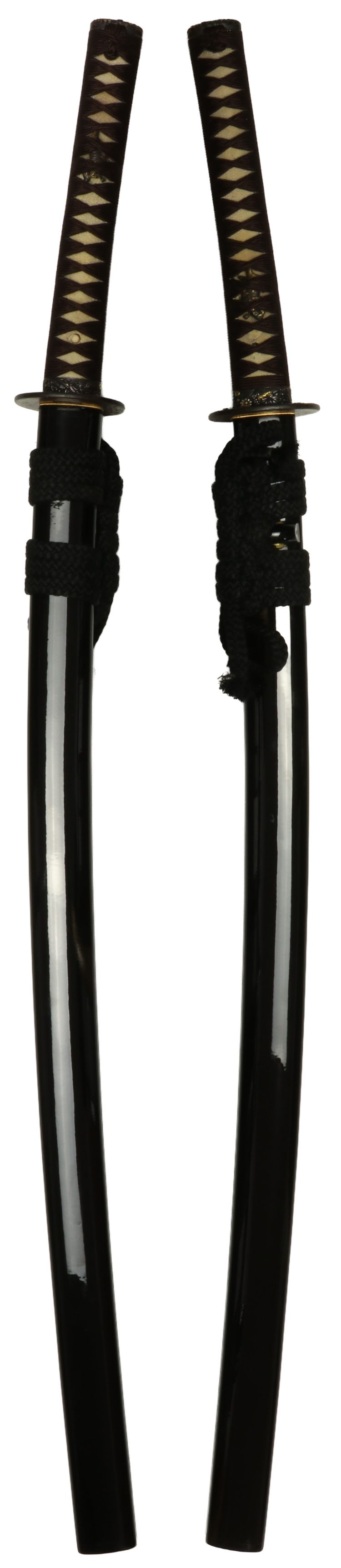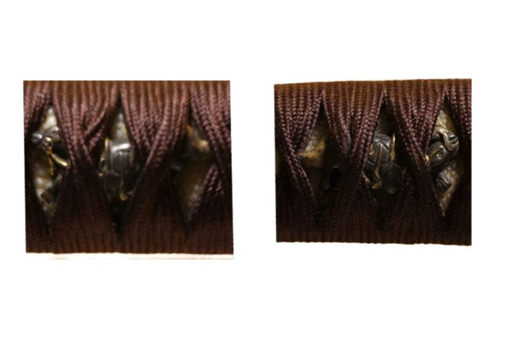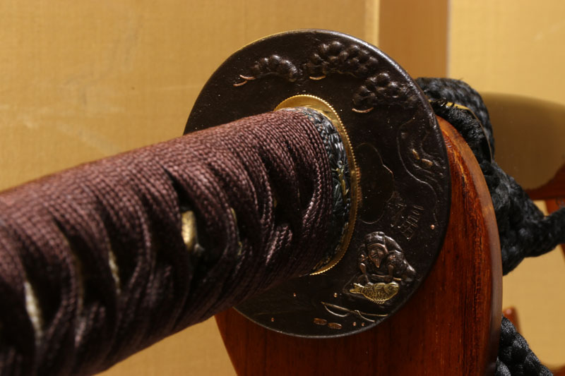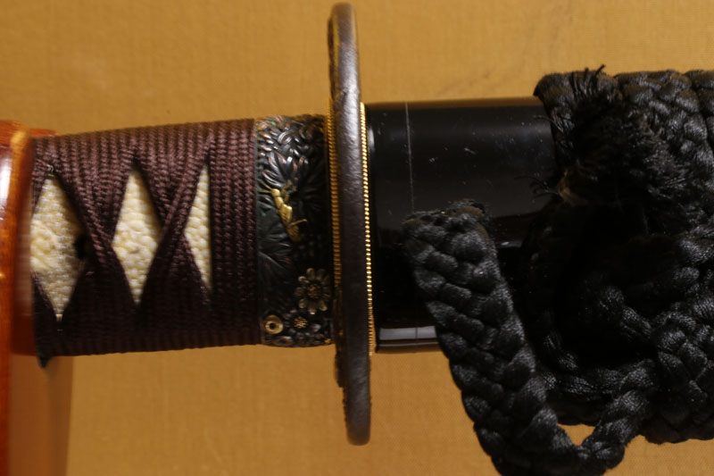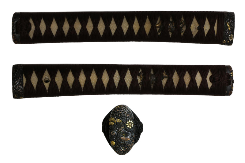 柄(tsuka) :鮫は巻鮫(見えないところに合わせ目が有ります)、柄巻は正絹焦げ茶色の諸撮み巻。