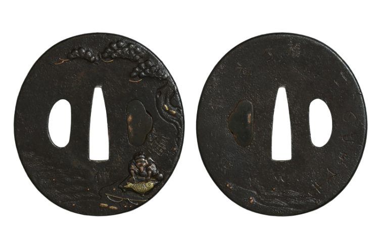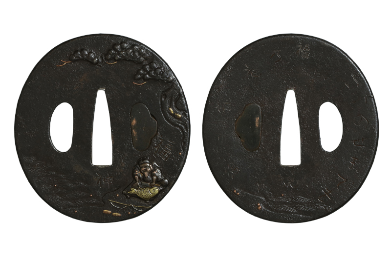 縁頭(fuchikashira): 赤銅魚子地菊の図。