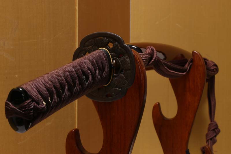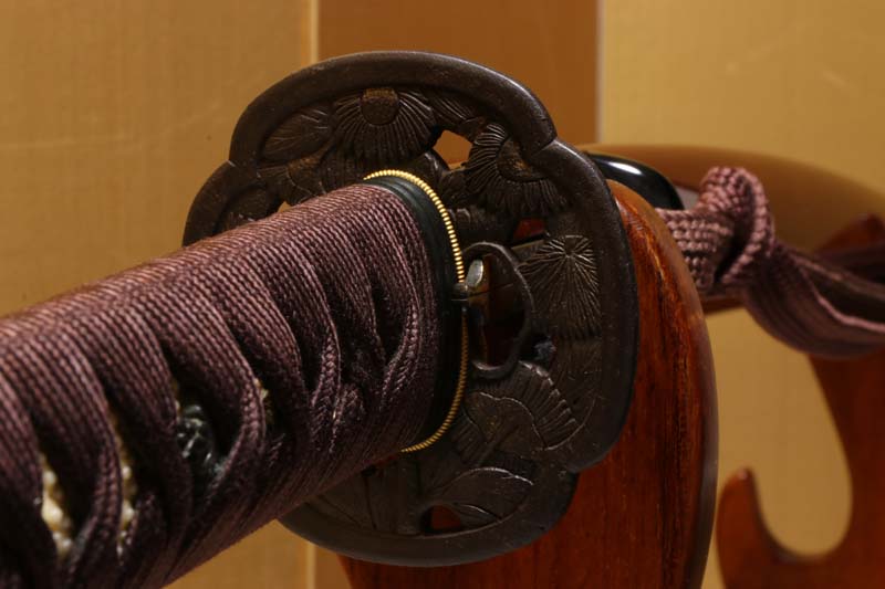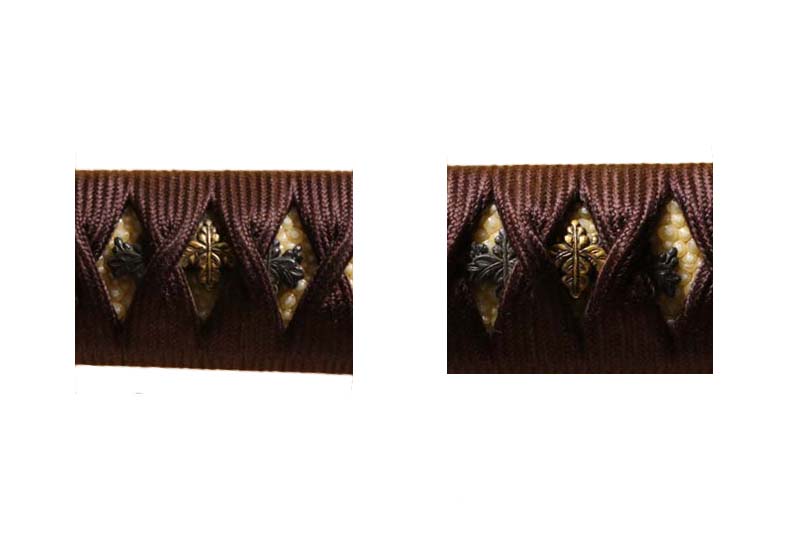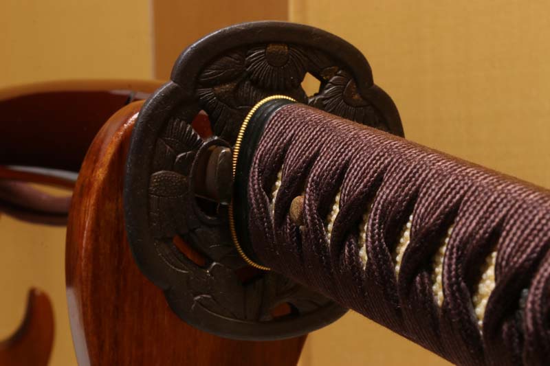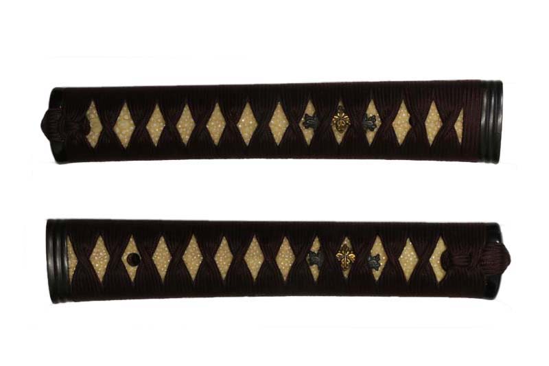 柄(tsuka) :鮫は親粒がつく、柄糸は正絹焦げ茶色の諸撮み巻。