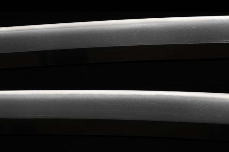 The mihaba and kasane are of standard proportions, with a somewhat pronounced koshizori and relatively strong curvature overall, and a medium-sized kissaki (chū-kissaki).