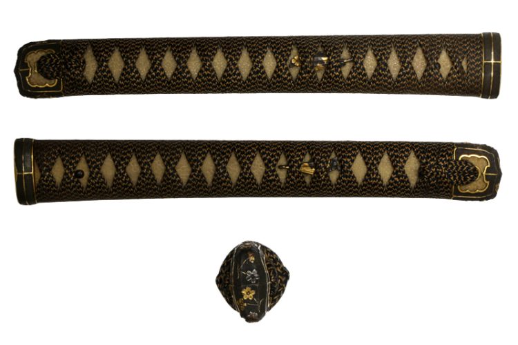 縁頭(futikasira):赤銅魚子地桜金銀象嵌太刀金具。