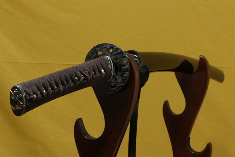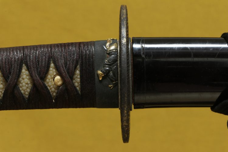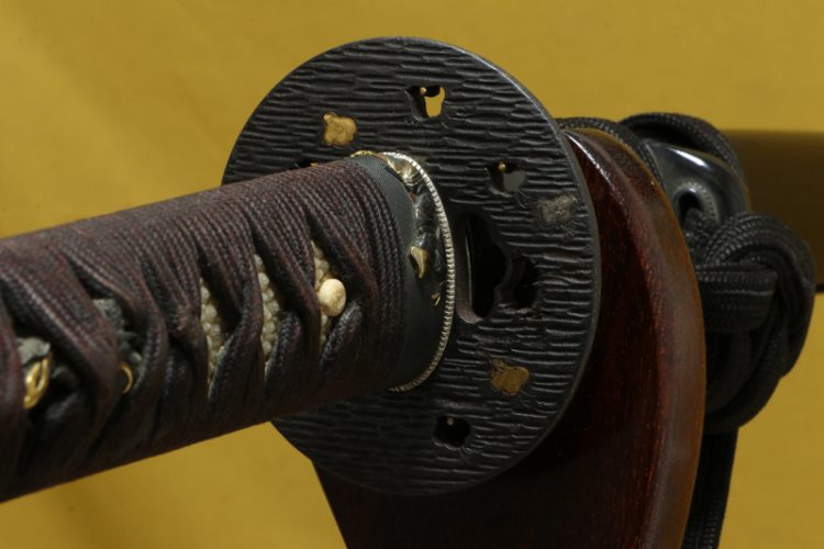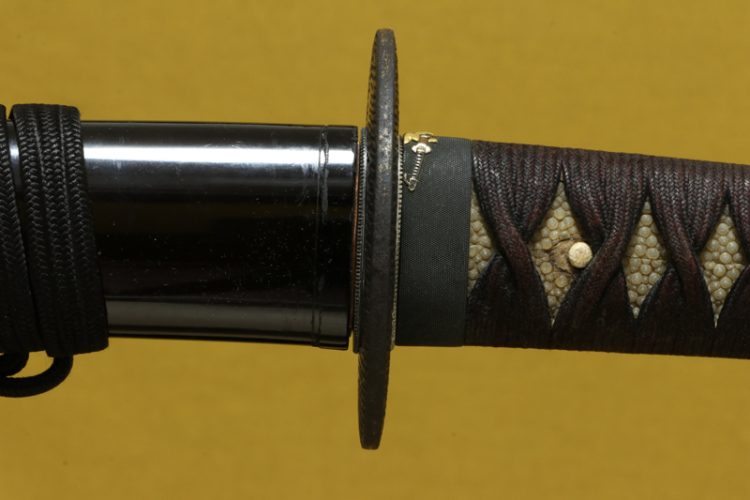 柄(tsuka) :柄は親粒が付き巻鮫、柄糸は正絹焦げ茶色の諸捻り巻。The tsuka is finished in makizame style with prominent oyatsubu (large central nodes), and the tsuka-ito is brown silk wrapped in mori-hineri-maki style.