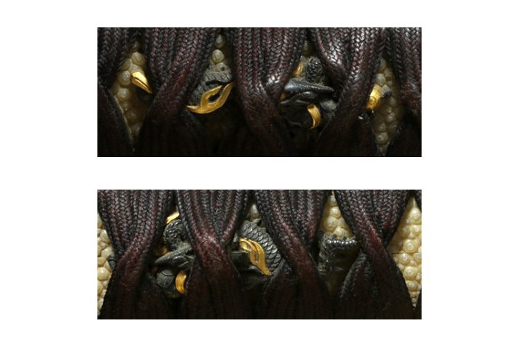 目貫(menuki) :赤銅地龍の図。A dragon design on a shakudo ground.