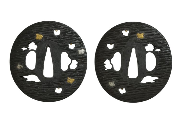 鍔(tsuba) :鉄地鶉の図金銀象嵌。An iron tsuba with a quail design in gold and silver inlay.