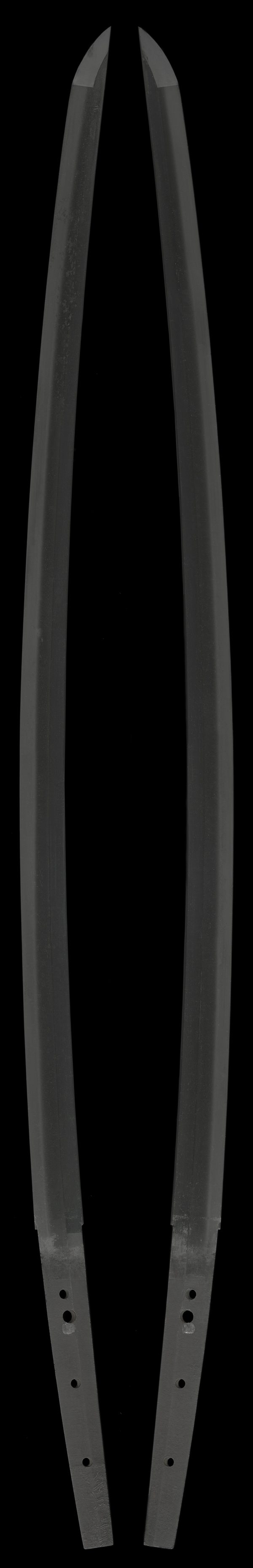 The tang (nakago) has been suriage with the machi moved upward (machi-okuri). The file marks are kiri-yasuri (horizontal), and the tang tip is cut straight in an ichimonji shape.