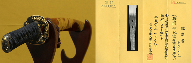 肥前国住藤原忠廣(近江大掾藤原忠廣)は、橋本平作郎といい、初代忠吉の子として生まれ、寛永九年(1632年)の父没後に忠廣を襲名しています。これは、父初代忠吉が元和十年(1624年)に 武蔵大掾を受領し忠廣へと銘を改め、忠吉銘は門人である後の土佐守に譲った為です。彼は寛永十八年(1641年)に近江大掾を受領、元禄六年(1693年)に八十歳で没する までの五十年以上の長きに渡って作刀を続けています。その為、寛永、寛文、元禄期とそれぞれの時代に応じた体配をした数多くの作品を残していますが、新刀の刀工中、初代 忠吉に次ぎ、2番目に多く重要刀剣に指定されており、如何に名刀が多いかが分かります。