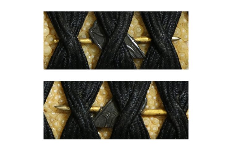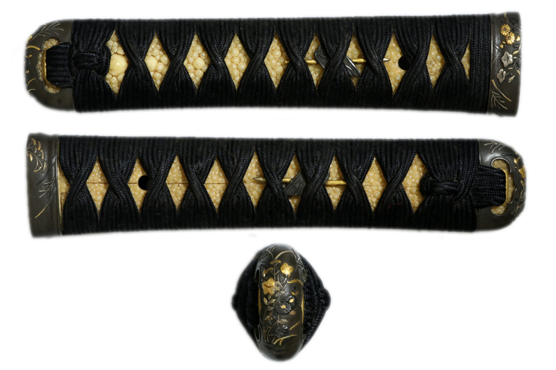柄(tsuka) :鮫は親粒が付き巻鮫。柄巻は正絹黒の諸撮み巻。