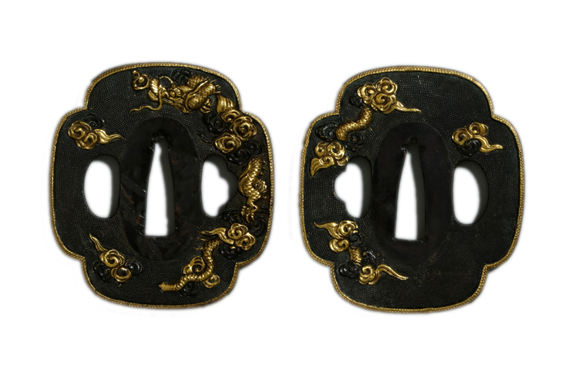 鍔(tsuba) :赤銅魚子地木瓜形金覆輪龍の図。