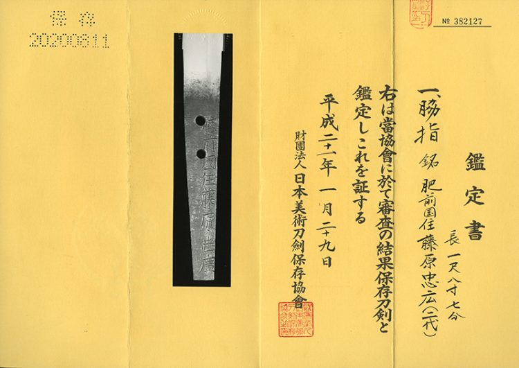 Hizenkuni ju Fujiwara Tadahiro (omi Daijo Fujiwara Tadahiro), also known as Hashimoto Heisakuro, was the son of the first-generation Tadayoshi. Upon the death of his father in Kan’ei 9 (1632), he succeeded to the name Tadahiro. This succession took place because his father, the first-generation Tadayoshi, had been granted the honorary title of Musashi Daijo in Genna 10 (1624), at which time he changed his signature to Tadahiro and passed on the Tadayoshi name to his disciple, who would later become Tosa no Kami.