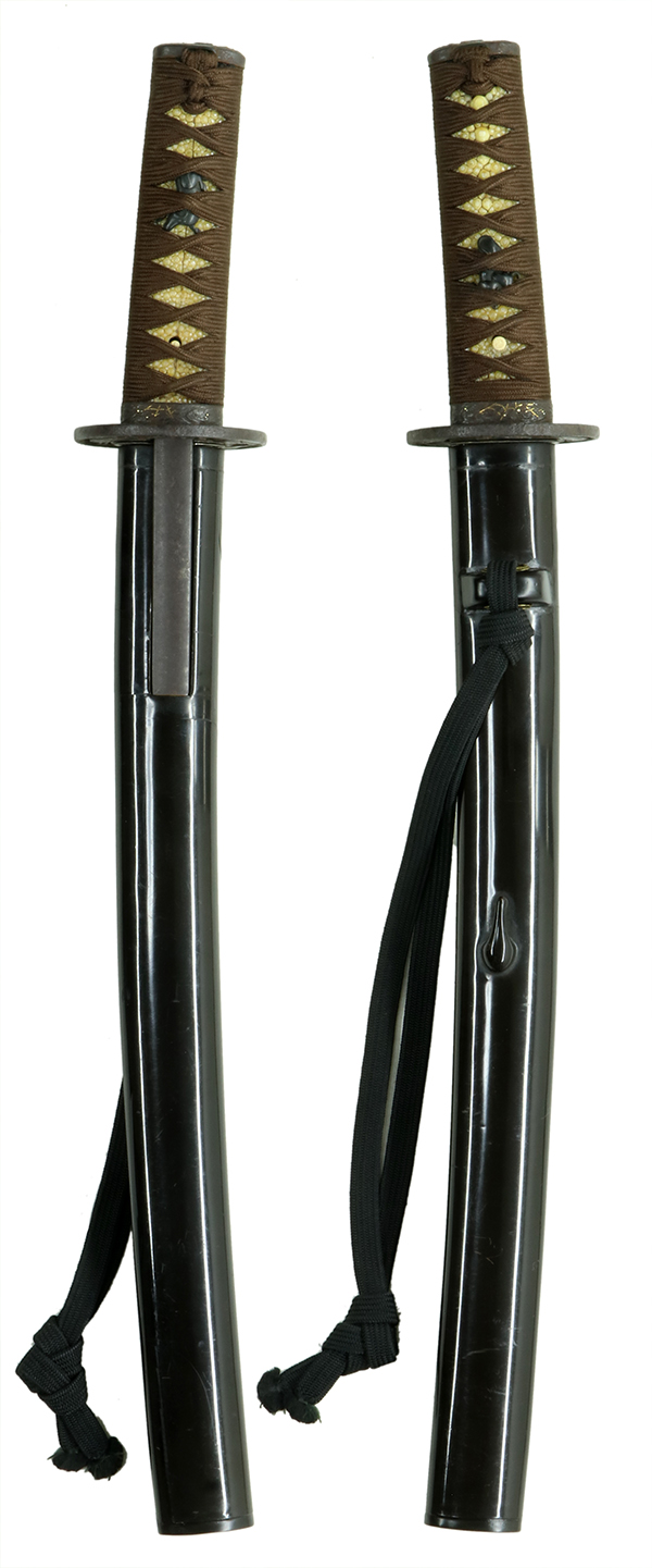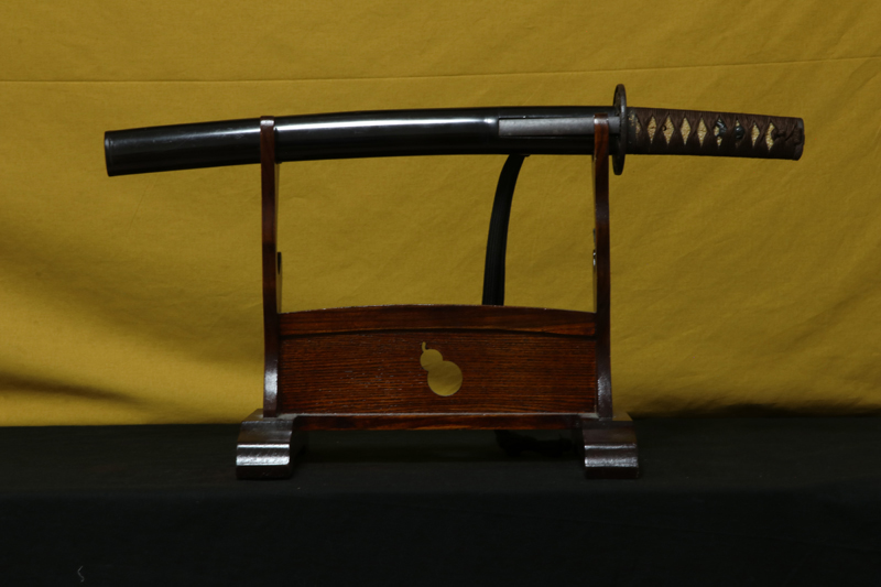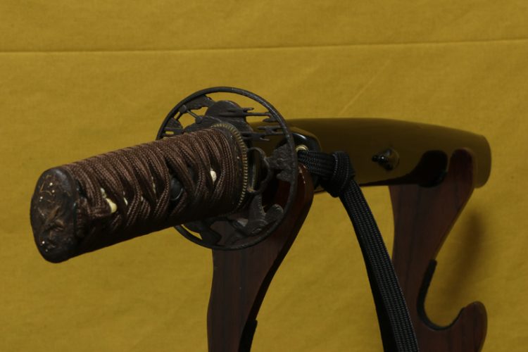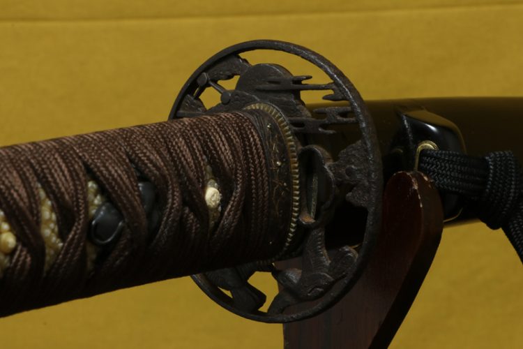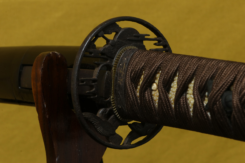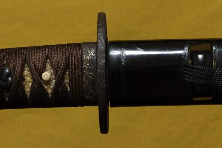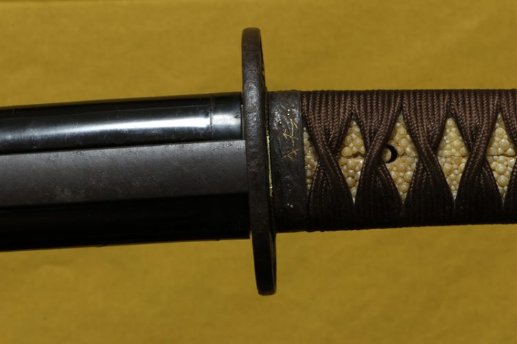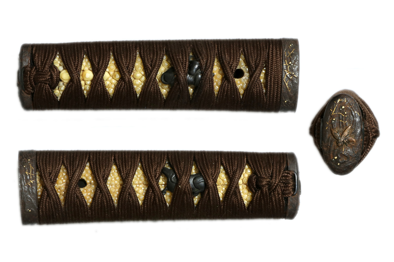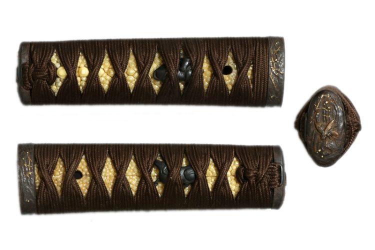 柄(tsuka) :鮫は親粒が付き巻鮫、柄糸は正絹焦げ茶色の諸撮み巻。