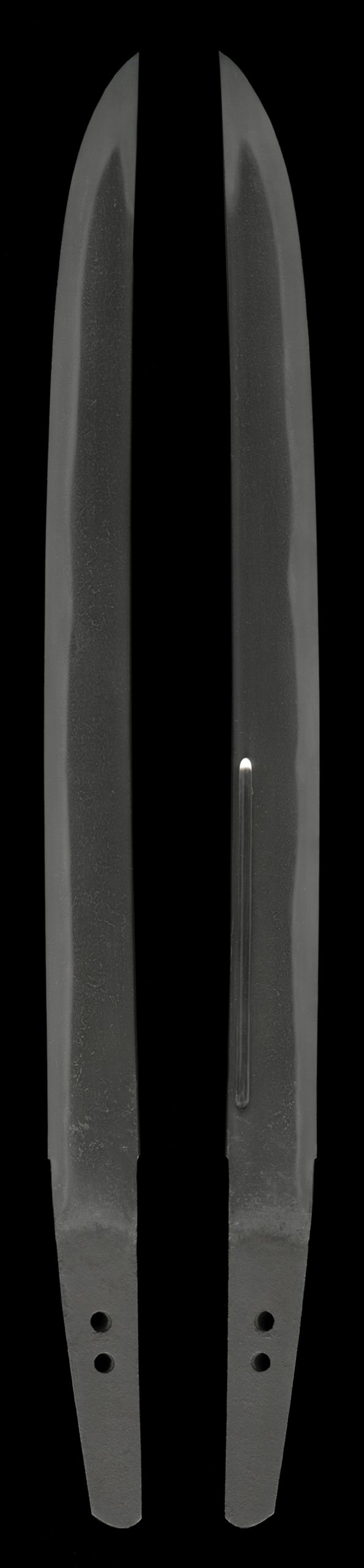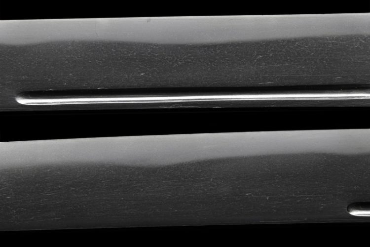 平造り庵棟、身幅重尋常、反り僅かふくら枯れる。茎は生で筋違い鑢がかかり、茎尻は刃上がりの栗尻。