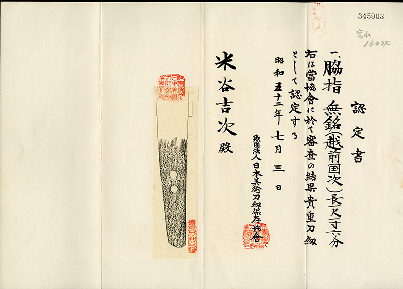 Although the certificate for this Kicho Token lists only “Echizen Kunitsugu,” the only smith using the name Kunitsugu in Echizen during the Keichō period was Yamashiro Daijo Fujiwara Kunitsugu.