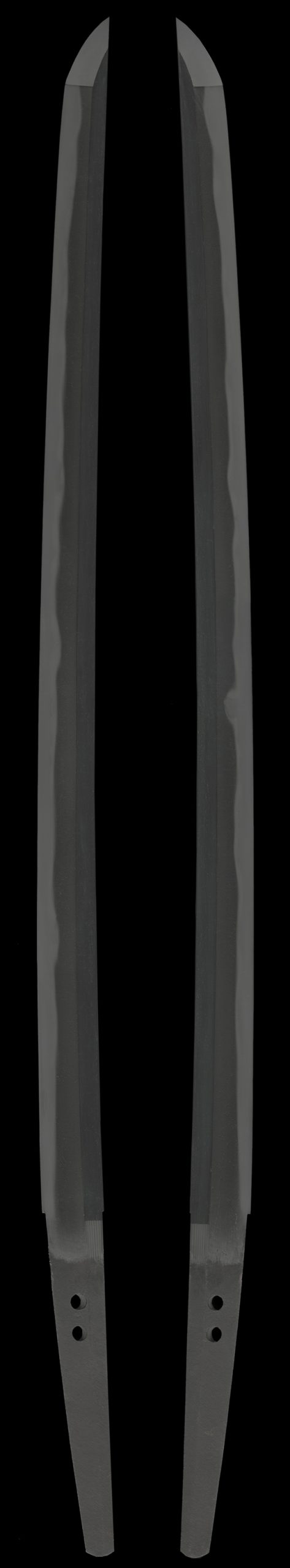 鎬造り庵棟、身幅重尋常、鳥居反り中鋒。茎は生で筋違い鑢がかかる、茎尻は栗尻。