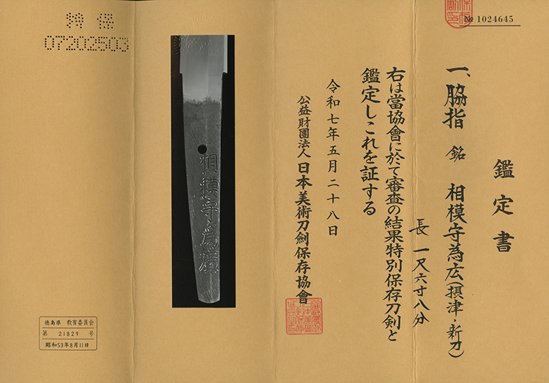 相模守為康(さがみのかみ ためやす)は、江戸時代初期(寛文頃)に大坂で活躍した刀匠で、大坂石堂派に属しています。生国は紀州で、備中守康廣の門人です。