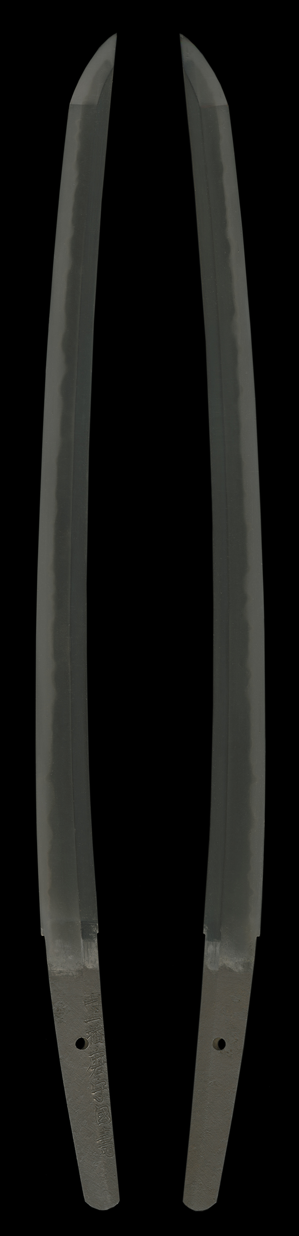 Shinogi-zukuri style with an iorimune (slightly rounded back), standard width and thickness, torii-zori curvature, and a medium-length kissaki (tip). The tang (nakago) is left unaltered (ubu), with a decorative file mark (kesho-yasuri), and the end of the tang (nakagojiri) is a shallow kurijiri (rounded shape).