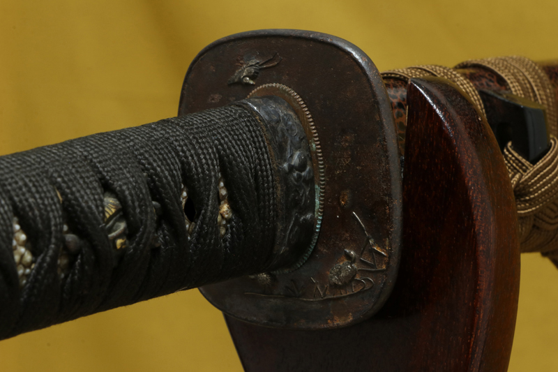 The koshirae (mounting) has some damage to the tsukamaki (handle wrapping), but the lacquered saya (scabbard) in kawari-nuri style remains in very good condition.