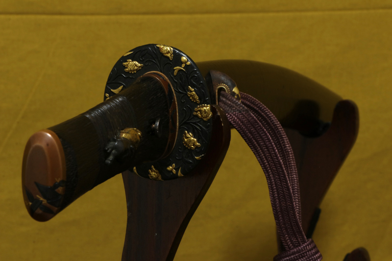 鍔(tsuba) : 赤銅魚子地秋草の図金色絵。