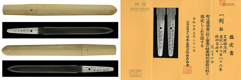 本作は、精緻な地鉄の鍛えに、調和のとれた直刃を焼いた逸品です。天田昭次刀匠の剣の作品は少なく貴重です、この機会をお見逃しなく!