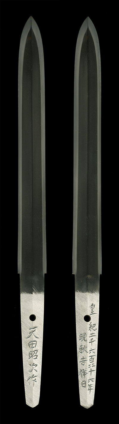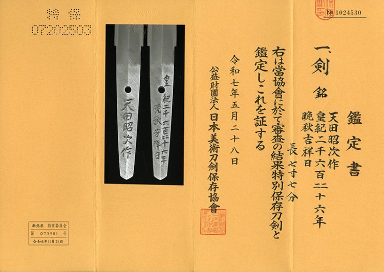 天田昭次は昭和2年、新潟県北蒲原郡本多村(現新発田市本田)生まれ、9歳の時に、父天田貞吉と死別、昭和15年には上京し、日本刀鍛錬伝習所で栗原彦三郎の門人となります。この時兄弟子には宮入昭平(行平)がいた。戦後昭和30年代に入るとメキメキと頭角を現し、新作刀展では、毎年優秀賞を受賞したが、これからという33歳の頃大病を患い、復活まで8年掛かる。その後、鍛刀を再開するに当たって、新発田市月岡の温泉街の外れに、自宅兼鍛刀場、『豊月山(ほうげつさん)鍛刀場』を構える。不撓不屈の精神で復活した昭次は、ここから快進撃が始る。昭和47年には無鑑査、昭和52年、60年、平成8年に、刀剣界の最高賞である『正宗賞』を三度受賞、同賞三度受賞は、隅谷正峯、大隅俊平に次いで三例目ですが、山城伝、相州伝、備前伝と、全て異なる作風で受賞したのは昭次のみです。平成9年には人間国宝となり、平成25年、85歳にて鬼籍に入る。