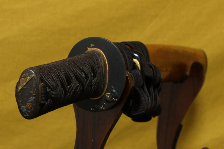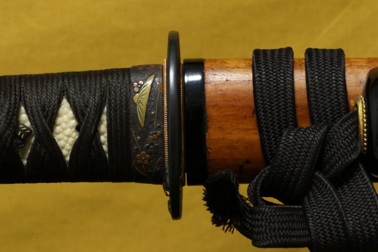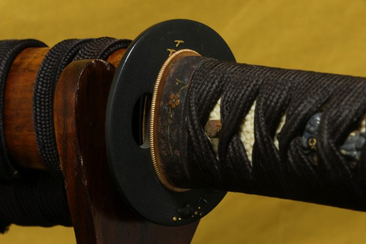 柄(tsuka) :鮫は親粒が付く、柄巻は正絹黒の諸撮み巻。