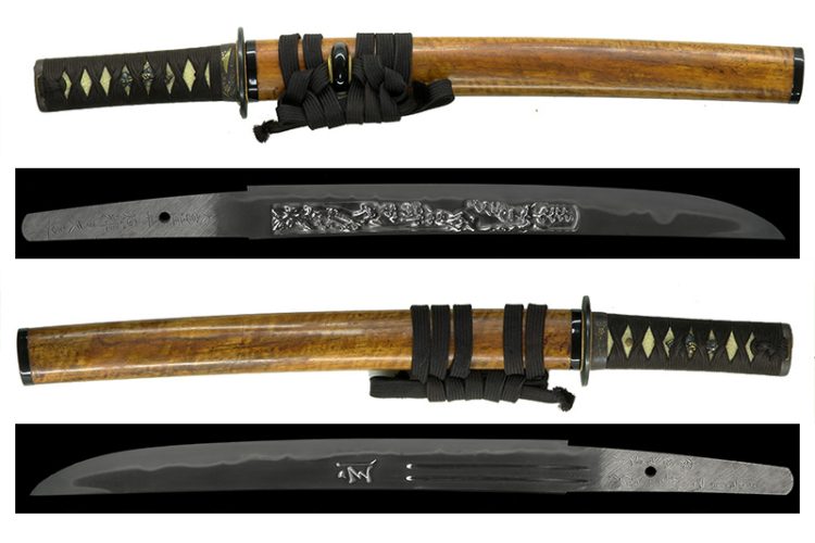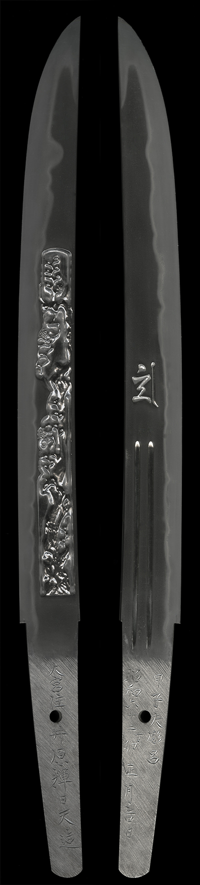 This piece is a tanto made in 1987 (Showa 62). The tang bears the inscription “Kinoe-Ne Uborō,” which appears to be the name of the carver, though the details are unknown.