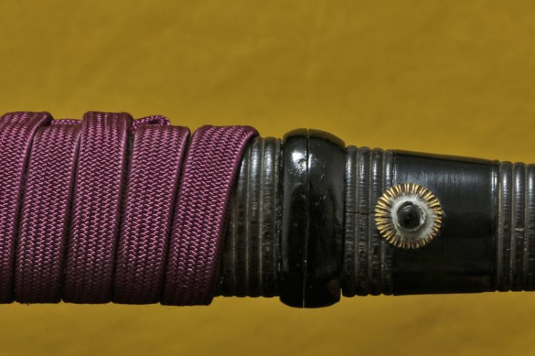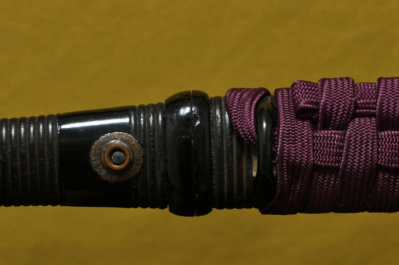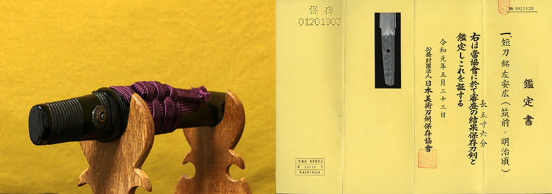 左一門は、鎌倉時代から南北朝にかけて筑州隠浜(現福岡市沖浜町)栄えた刀工集団で、特に有名なのは正宗十哲の一人とされる大左が有名です。その後は室町時代・江戸時代と続く。左安廣は、左一門の最後を飾る刀工です。刀身のコンディションは凄く良く、研ぎ上がりの様な状態です。拵のコンディション良好で鞘に少し傷が有る程度です。明治初期の懐剣です。刀身・拵共コンディションは良く、コレクション、または居合道、試斬道や弓道の前差に最適です。