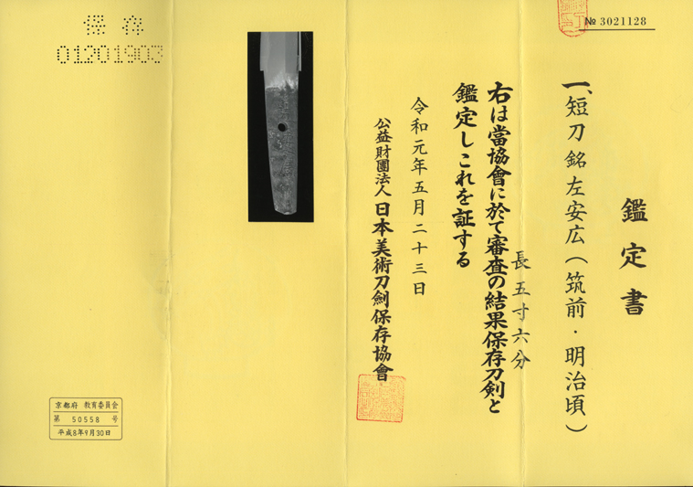 The Sa school was a group of swordsmiths that flourished in Chikushu Okihama (present-day Okihama-machi, Fukuoka City) from the Kamakura period through the Nanbokucho period. The most famous among them is O-Sa, who is regarded as one of the Masamune Juttetsu (Ten Great Disciples of Masamune). The lineage continued through the Muromachi and Edo periods, and Hidari Yasuhiro is considered the last swordsmith of the Hidari school.