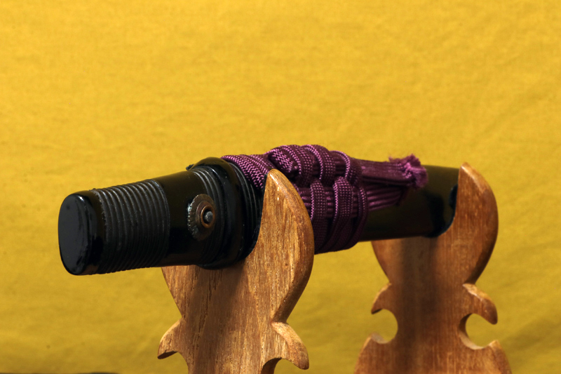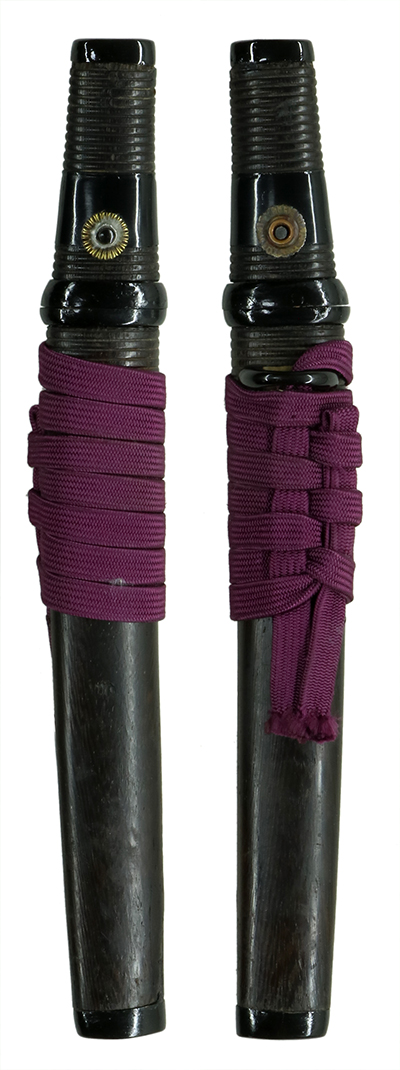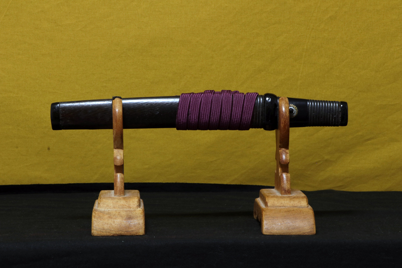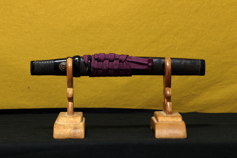懐剣拵。柄は真ん中を黒の縦刷毛目塗、その両側を千段刻み。鞘は焦げ茶の木目仕上げで、鯉口辺が千段刻み。
